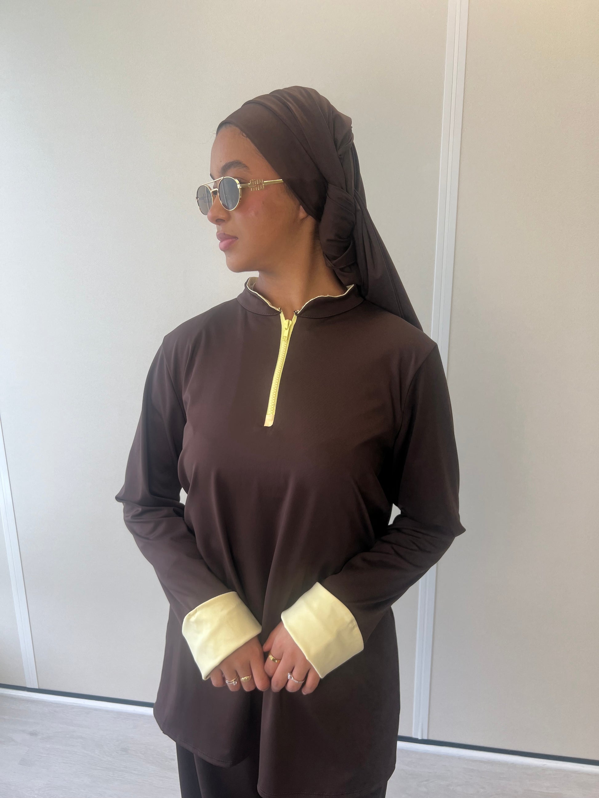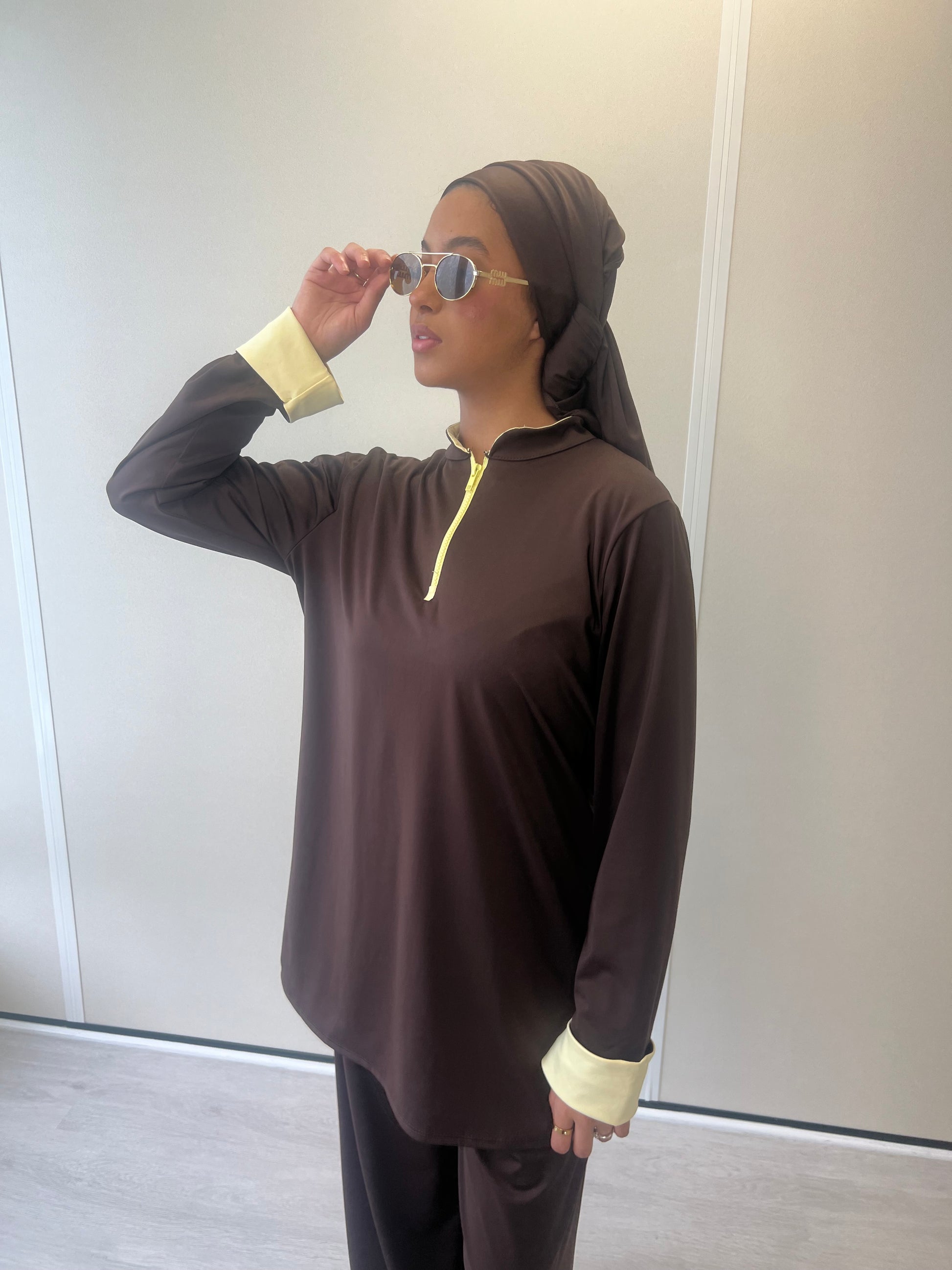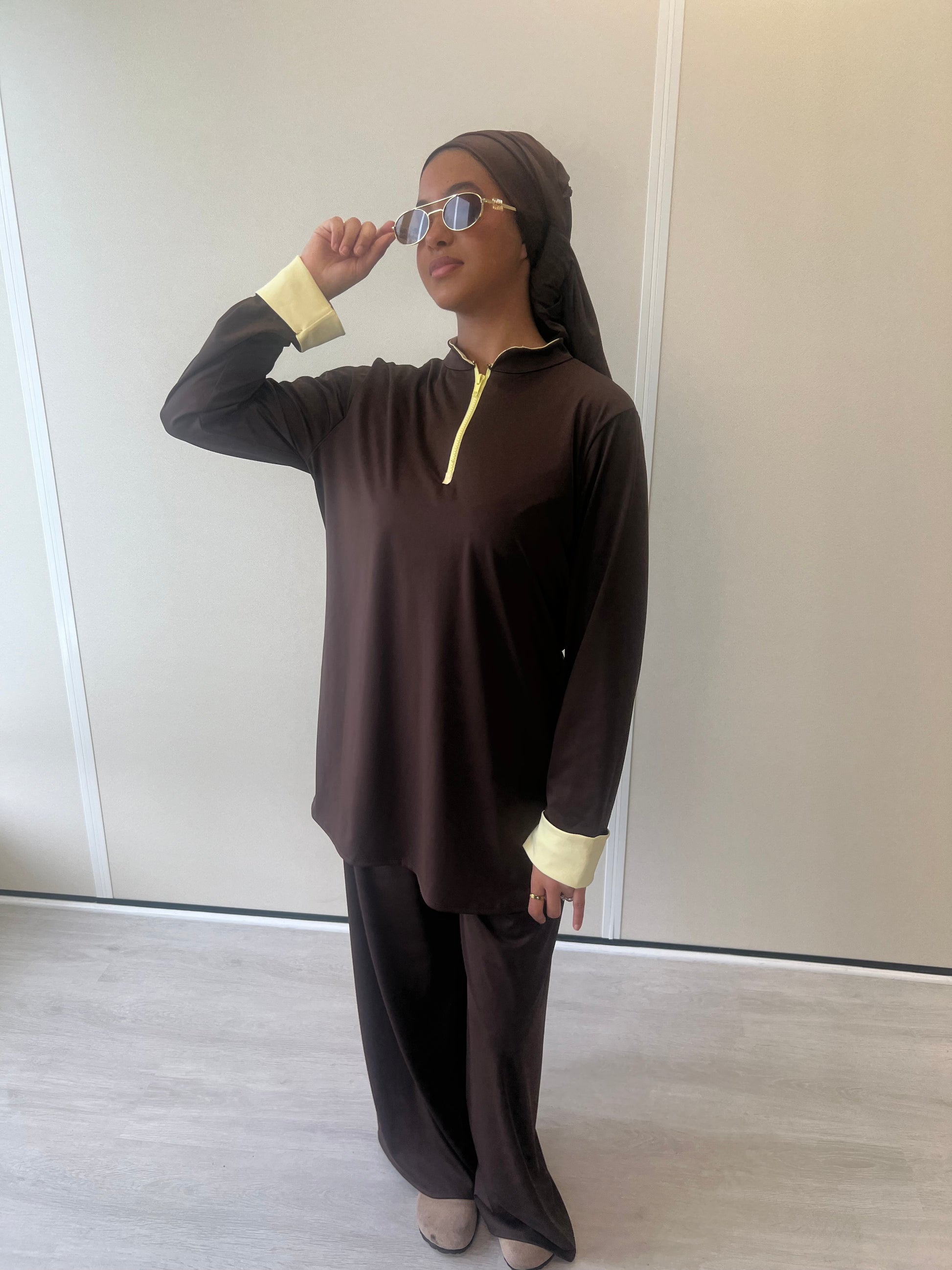 Il se compose d’un haut à manches longues, d’un pantalon assorti et d’un hijab parfaitement coordonné pour un look harmonieux et couvrant. Le design est moderne avec une coupe fluide qui assure une grande liberté de mouvement, tout en restant modeste. Les finitions contrastées au niveau des poignets et de la fermeture apportent une touche dynamique et tendance.