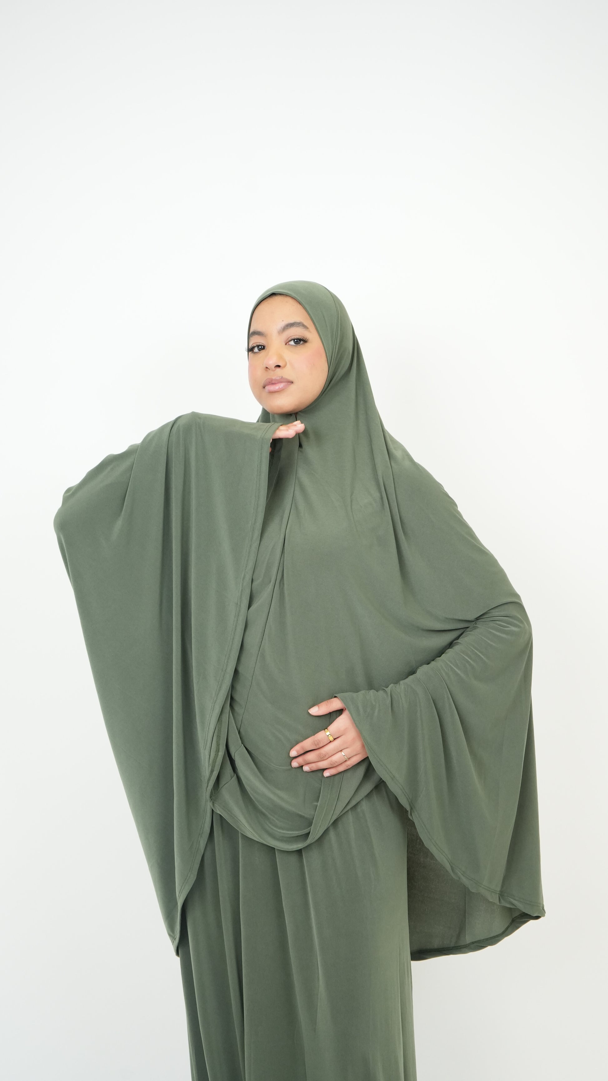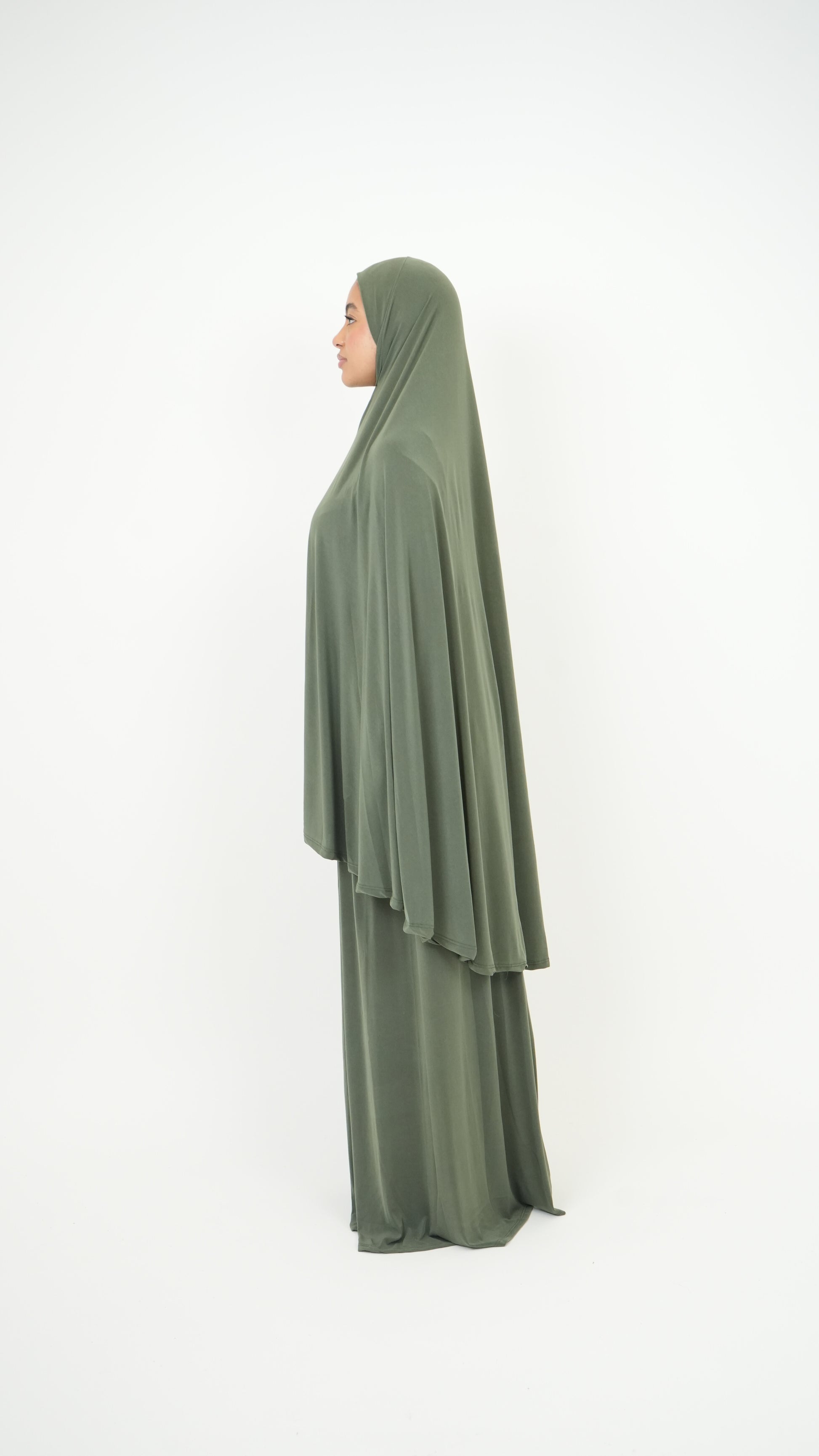 L’ensemble prière en jersey deux pièces, composé d'une jupe et d'un khimar, est une tenue élégante et pratique, spécialement conçue pour les moments de recueillement