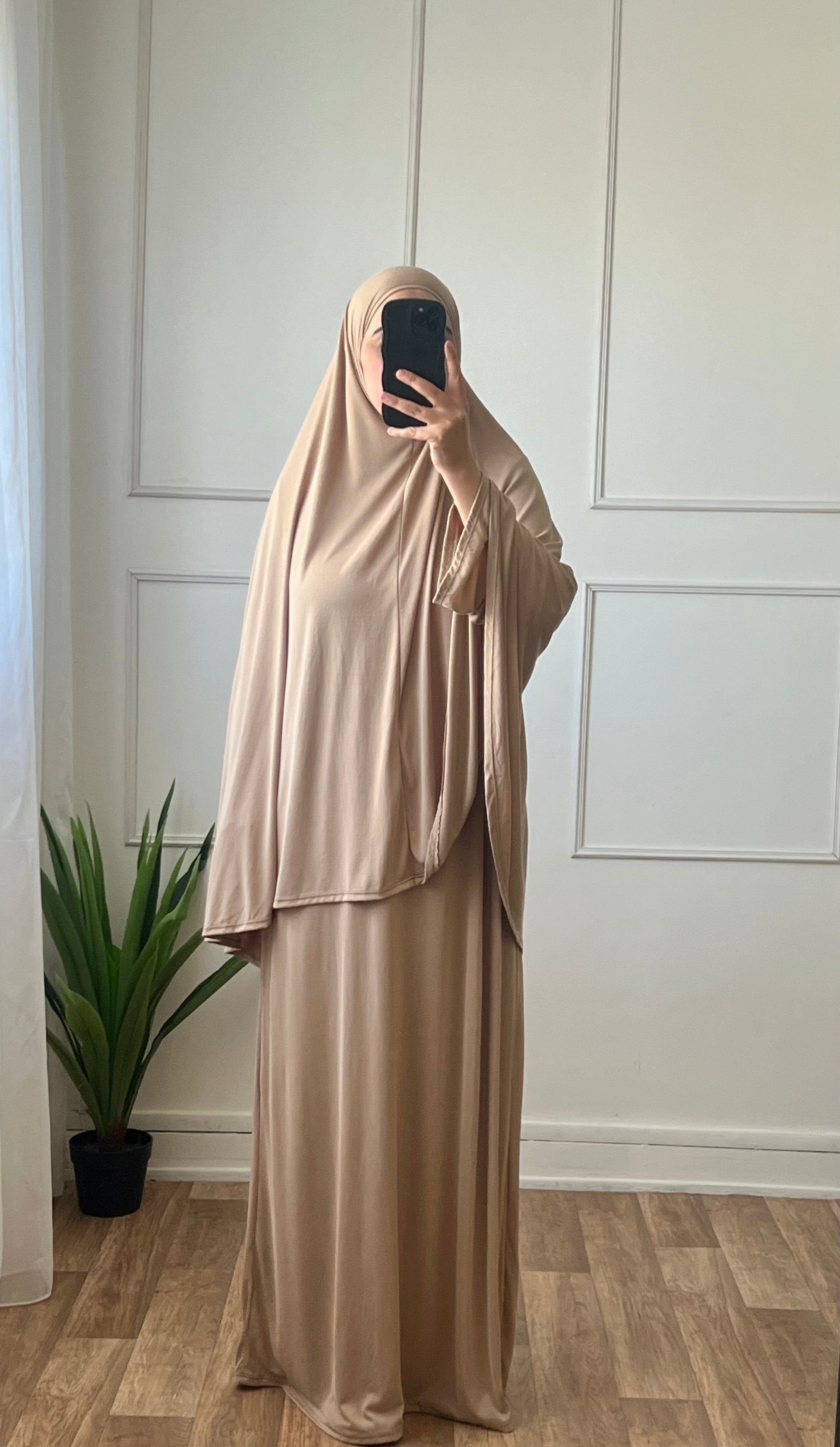 Découvrez cet ensemble composé d’une abaya et d’un khimar en jersey premium, un tissu léger, opaque et respirant, offrant un confort optimal au quotidien.